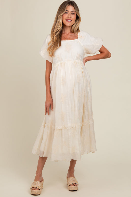 Cream Mesh Tiered Long Sleeve Maternity Maxi Dress