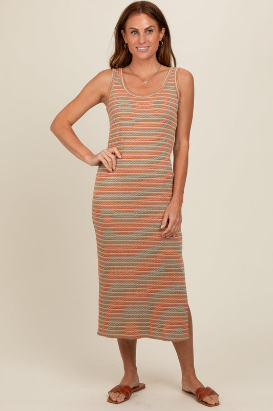 Brown Ruffle Mock Neck Long Sleeve Midi Dress