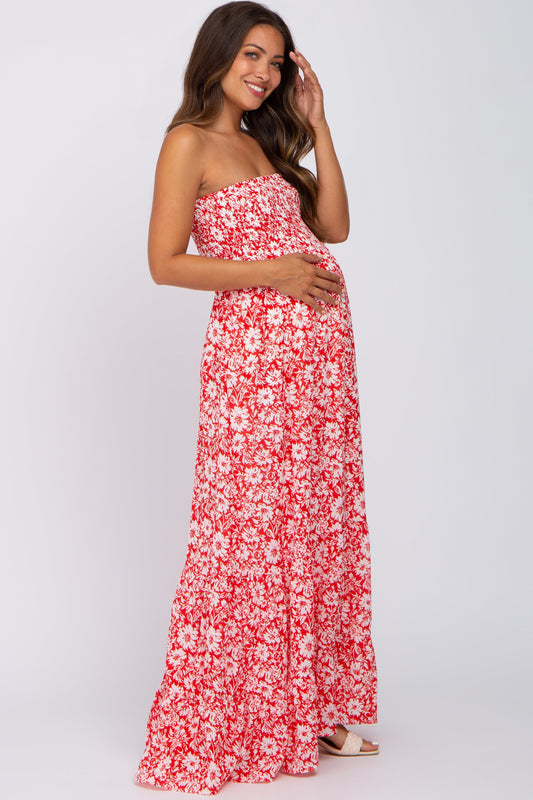 Red Floral Strapless Smocked Maternity Maxi Dress
