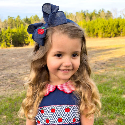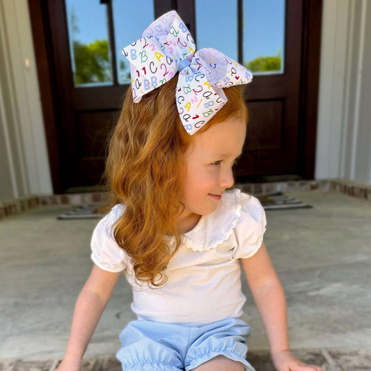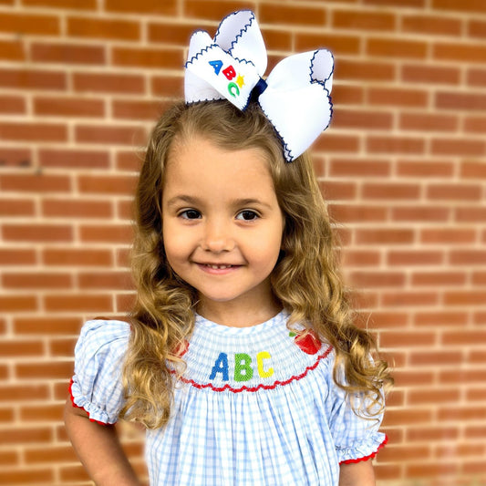 ABC Embroidery Grosgrain Hair Bow with Navy Moonstitch Edge