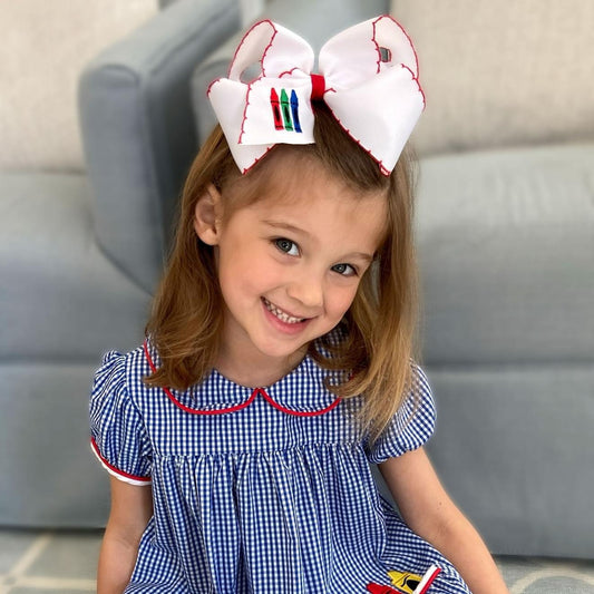 Crayons Embroidery Grosgrain Hair Bow with Red Moonstitch Edge