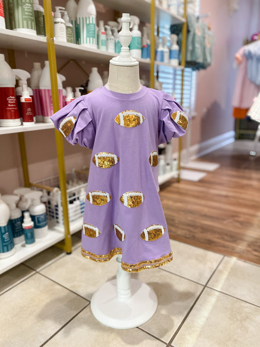 Purple Sequin Football Dress – Girls Bubble Sleeve Game Day A-Line