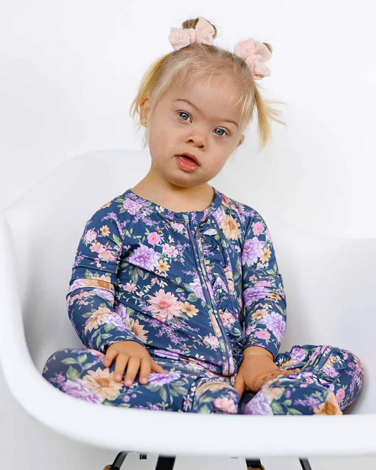 Josephine Ruffled Zippered Footie – Bamboo Baby Sleeper with Floral Print & Heart Grips