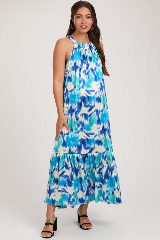 Blue Watercolor Print Satin Maternity Midi Dress