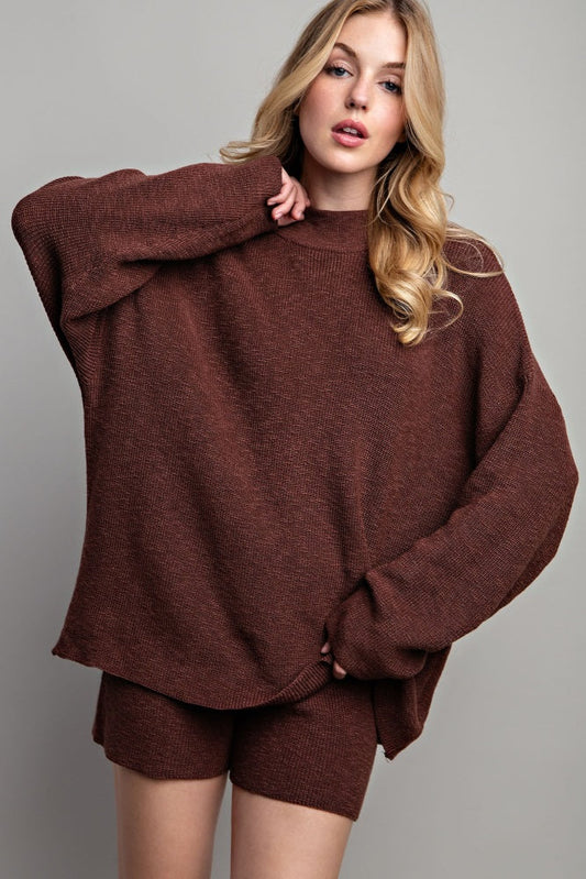 Brown Ruffle Mock Neck Long Sleeve Midi Dress