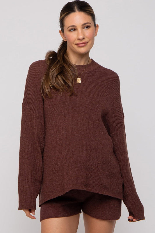 Brown Waffle Knit Sash Tie Maternity Midi Sweater Dress