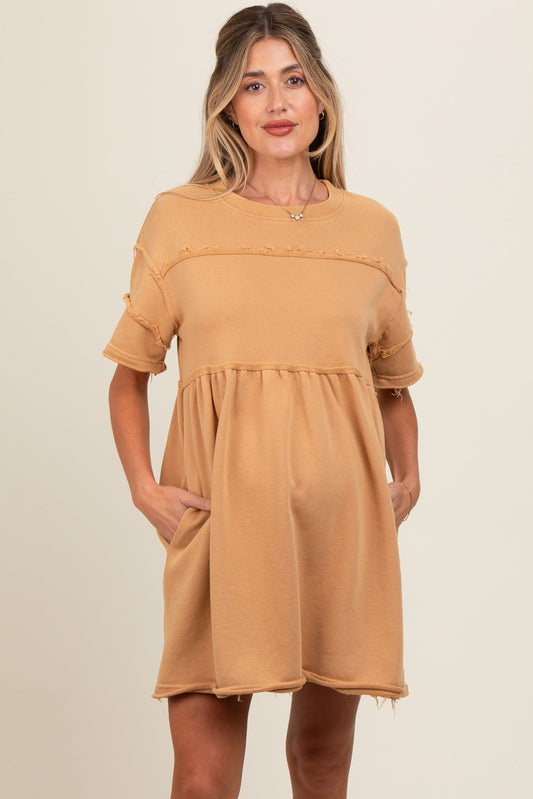 Camel Raw Hem Maternity Short Sleeve Dress