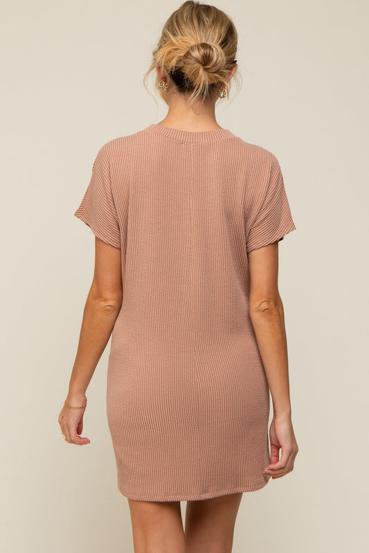 Camel Ribbed Front Pocket Dolman Short Sleeve Maternity Dress