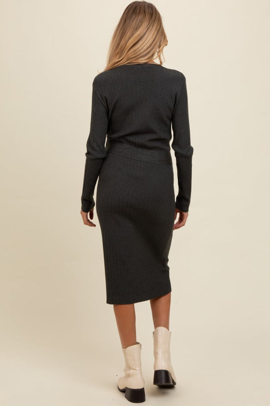 Charcoal Ribbed Sash Tie Maternity Midi Sweater Dress