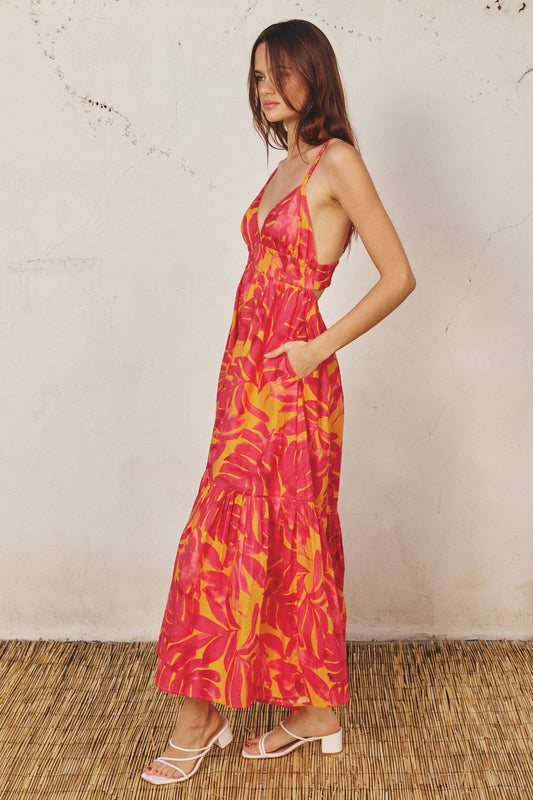 Coral Leaf Print Open Back Midi Dress