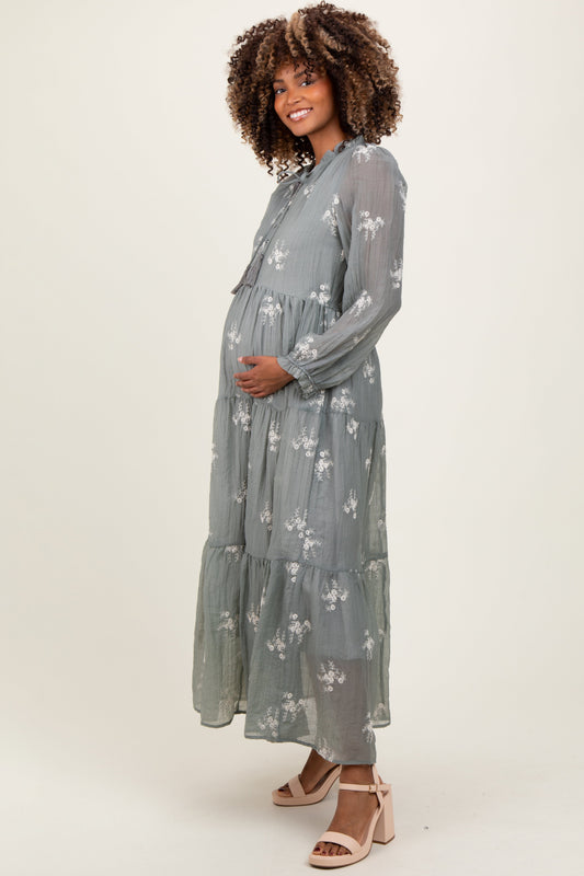 Gray Embroidered Tassel Tie Tiered Maternity Midi Dress