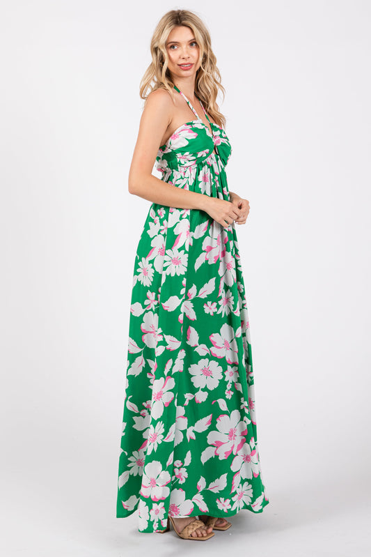 Green Floral Mesh Overlay Fitted Maxi Dress