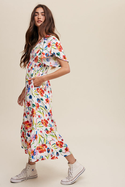 Ivory Floral Flutter Sleeve Smocked Midi Dress