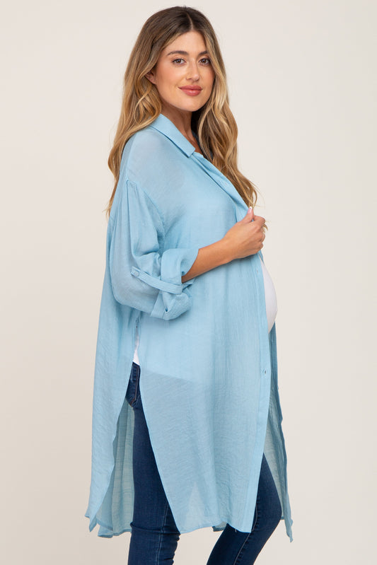 Light Blue Button Front Side Slit Oversized Maternity Blouse