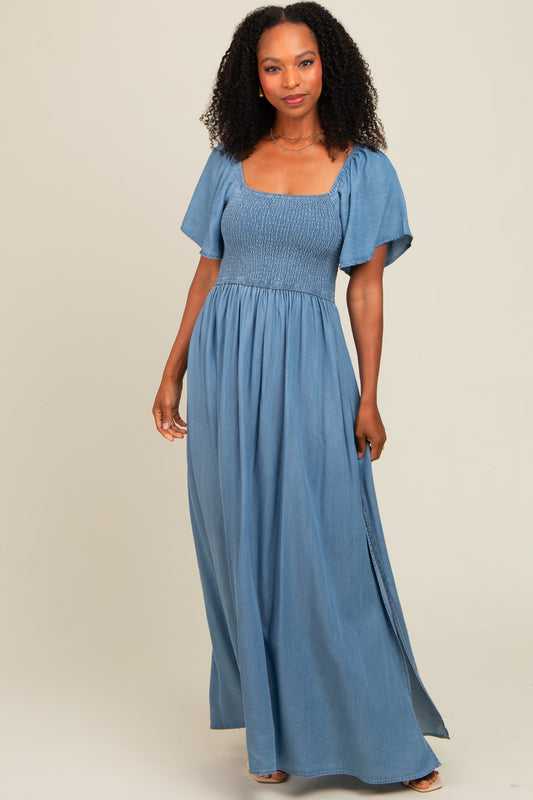 Light Blue Chambray Smocked Maternity Maxi Dress
