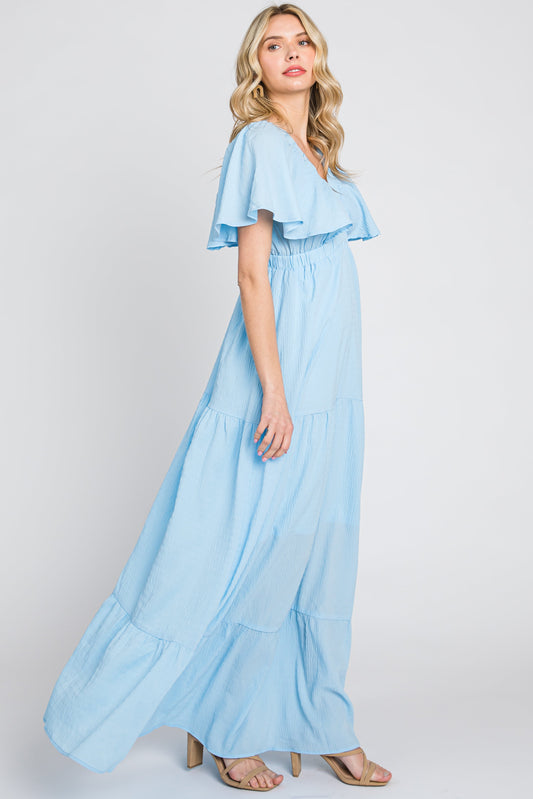 Light Blue Crepe Flounce Sleeve Tiered Maxi Dress