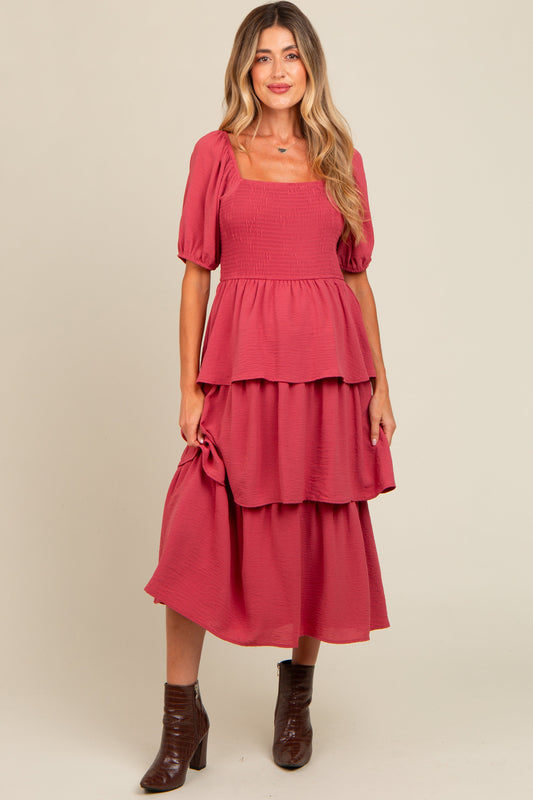 Magenta Smocked Body Ruffled Tiered Maternity Midi Dress