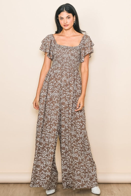Mocha Floral Smocked Triple Front Tie Midi Dress