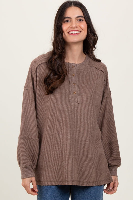 Mocha Oversized Ribbed Knit Henley Maternity Sweater