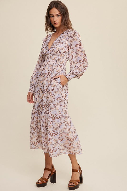 Mocha Leaf Print Ruffled V-Neck Chiffon Maxi Dress