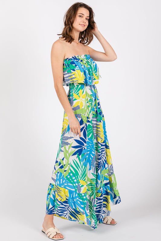 Multi-Color Palm Strapless Ruffle Wide Leg Jumpsuit