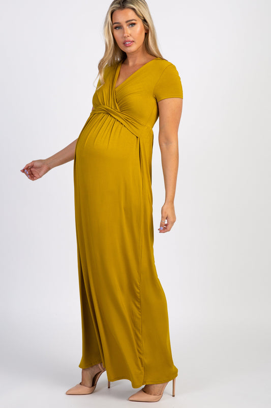 Mustard Leaf Print Smocked Fitted Maternity Midi Dress
