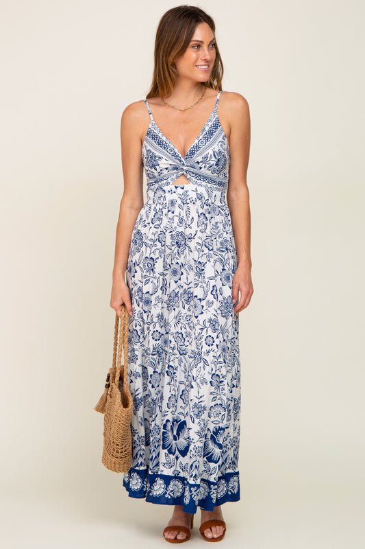 Navy Blue Floral Front Twist Maternity Maxi Dress
