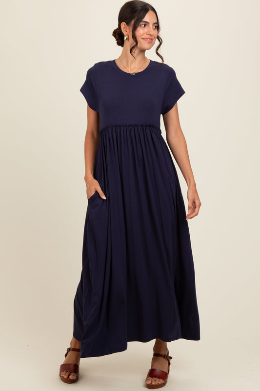 Navy Satin Smocked Ruffle Hem Maternity Dress