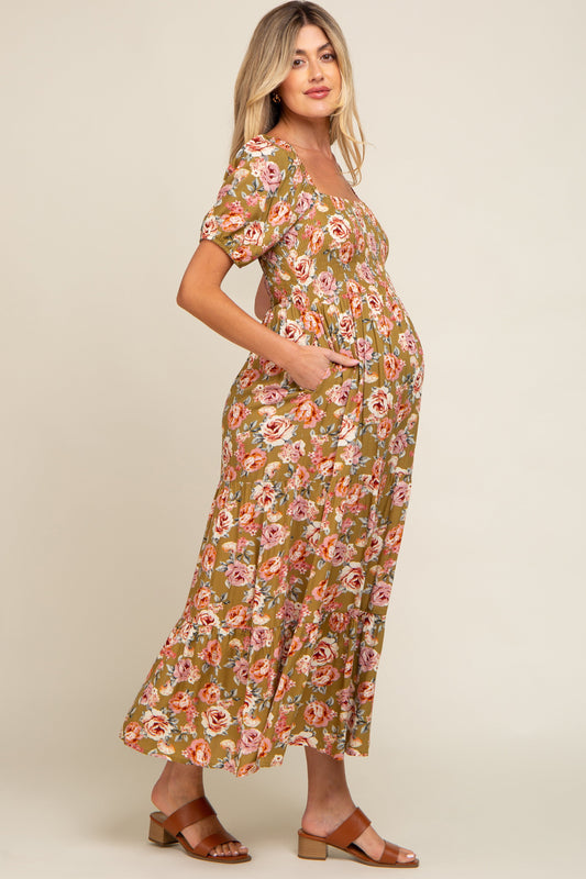 Olive Floral Smocked Square Neck Tiered Maternity Maxi Dress