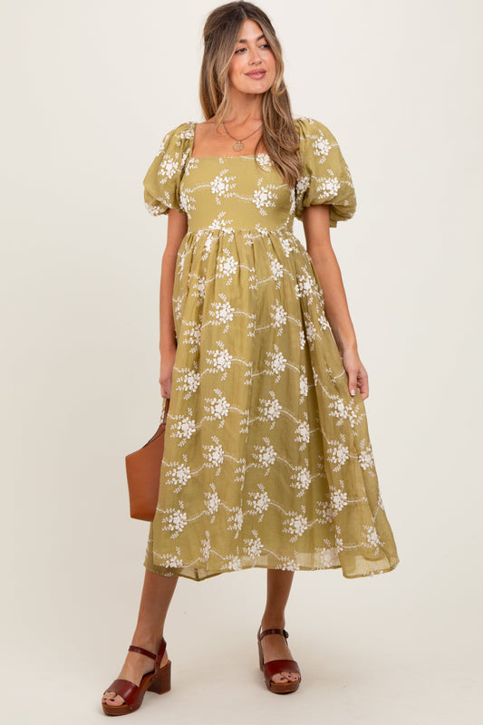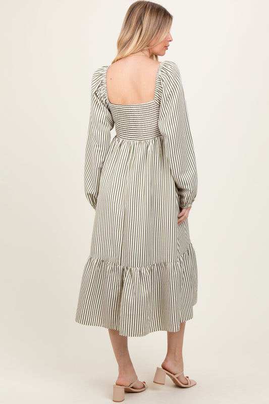 Olive Striped Ruched Bodice Balloon Sleeved Midi Dress