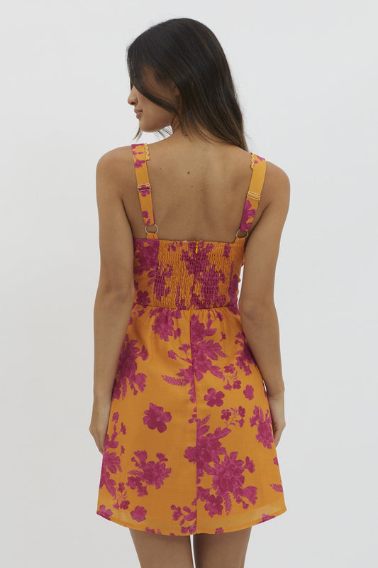Orange Sleeveless Floral Print Front Tie Mini Dress