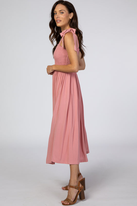 Pink Smocked Off Shoulder Long Sleeve Maternity Dress