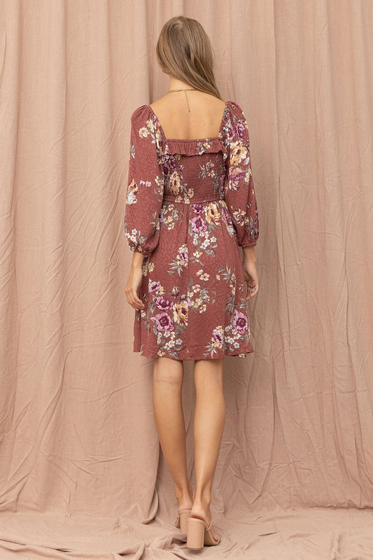 Wine Jacquard Floral Print Dress