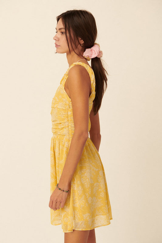 Yellow Floral Swiss Dot Chiffon One Shoulder Mini Dress