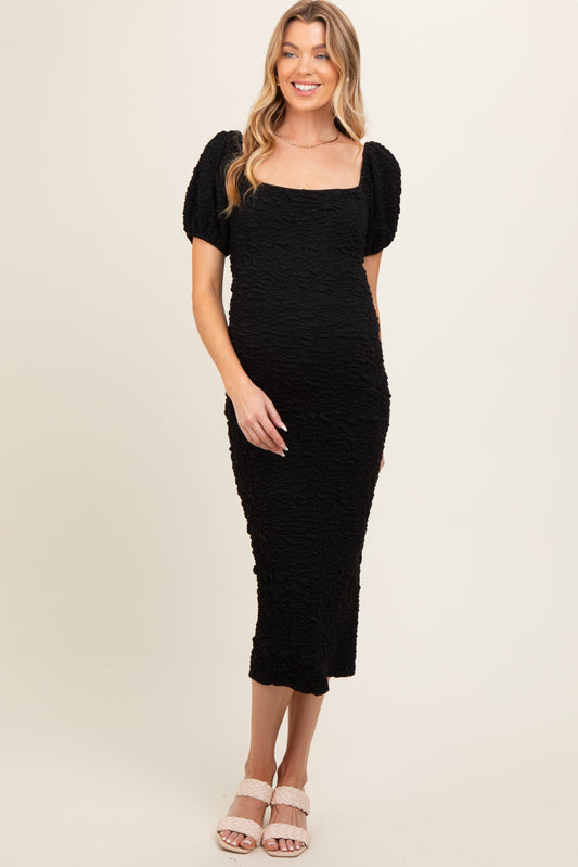 Black Textured Square Neck Puff Sleeve Maternity Midi Dress
