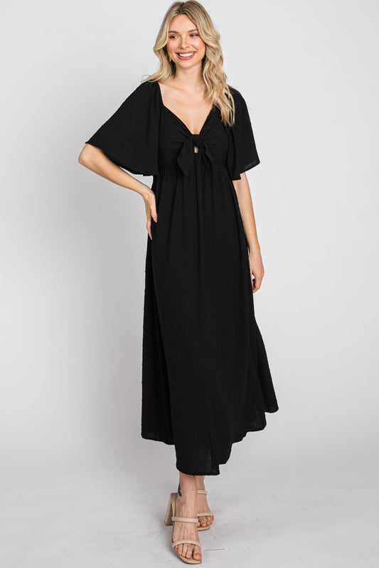 Black Textured Dot Front Tie Ruffle Sleeve Maternity Midi Dress