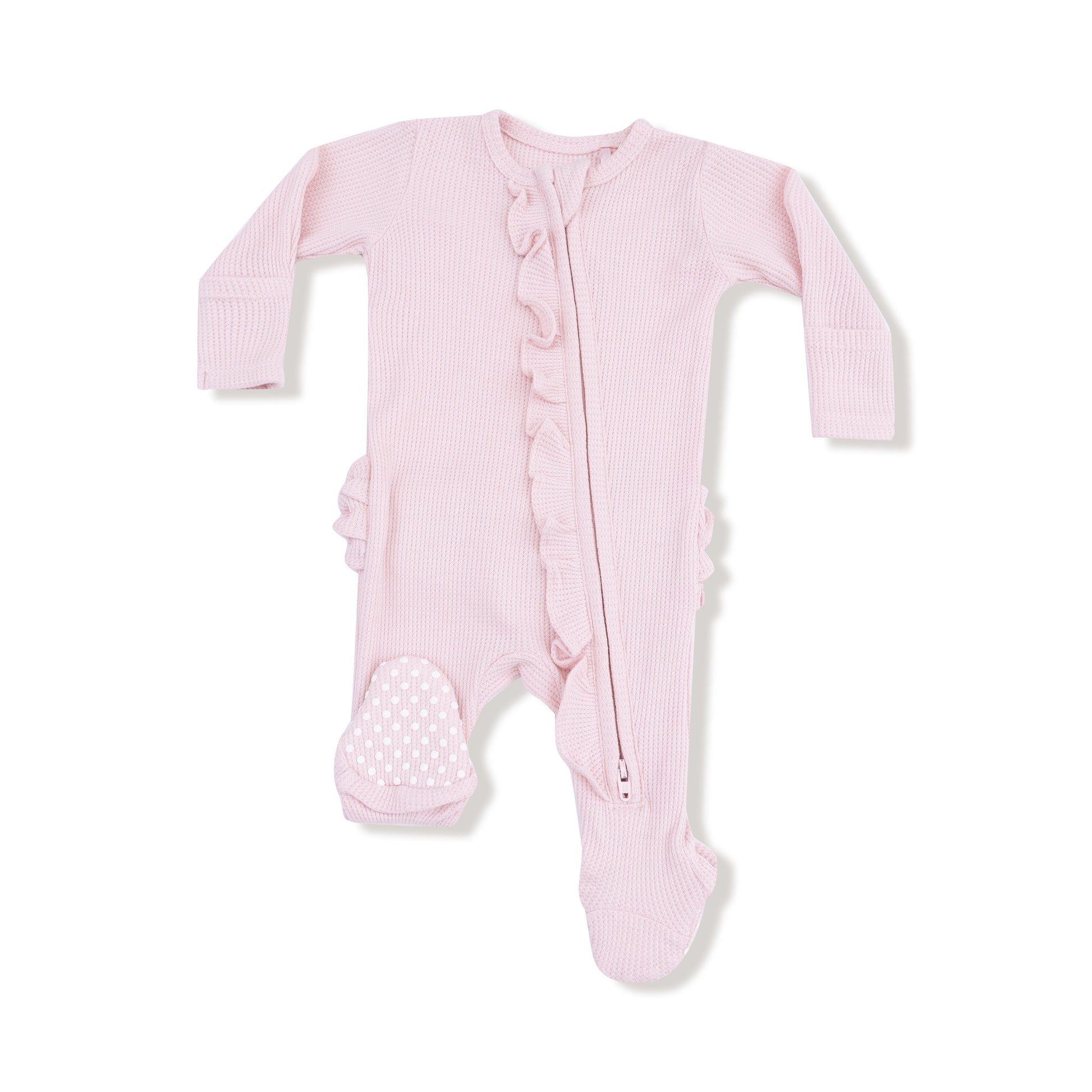 Dress your little one in effortless charm with our Ruffle Front 2-Way Zipper Footie. Crafted from buttery-soft waffle fabric, this footie is designed for ultimate comfort and easy changes. The delicate ruffle front detail adds a playful, elegant touch, making it a perfect choice for naptime, playtime, or anytime.