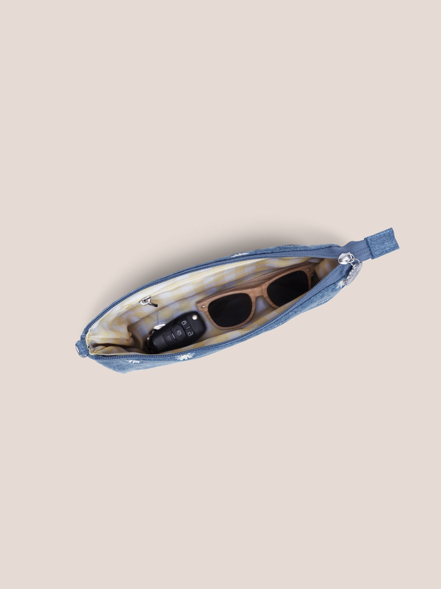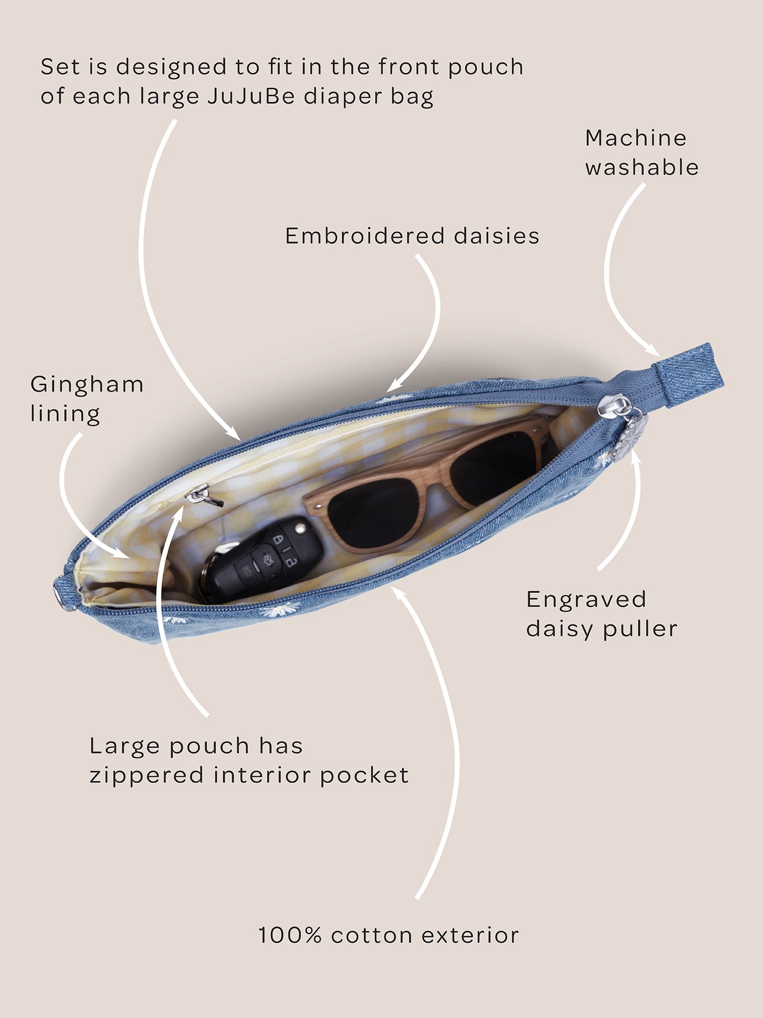 You know how it goes—always on the hunt for those essentials. Keep everything organized with the stylish, machine-washable 3-Piece Pouch Set from JuJuBe, perfect for stashing diapers, wipes, sunscreen, bandages, keys, and wallet, these pouches fit right into any JuJuBe diaper bag. Made with a 100% cotton exterior showcasing a light blue denim, embroidered daisies, and a cheerful yellow gingham lining, they add a handmade charm for the baby years and beyond. The large pouch even doubles as a small purse with its adjustable shoulder strap, and the detachable wristlet strap works with all three pouches. It's the ultimate win-win!