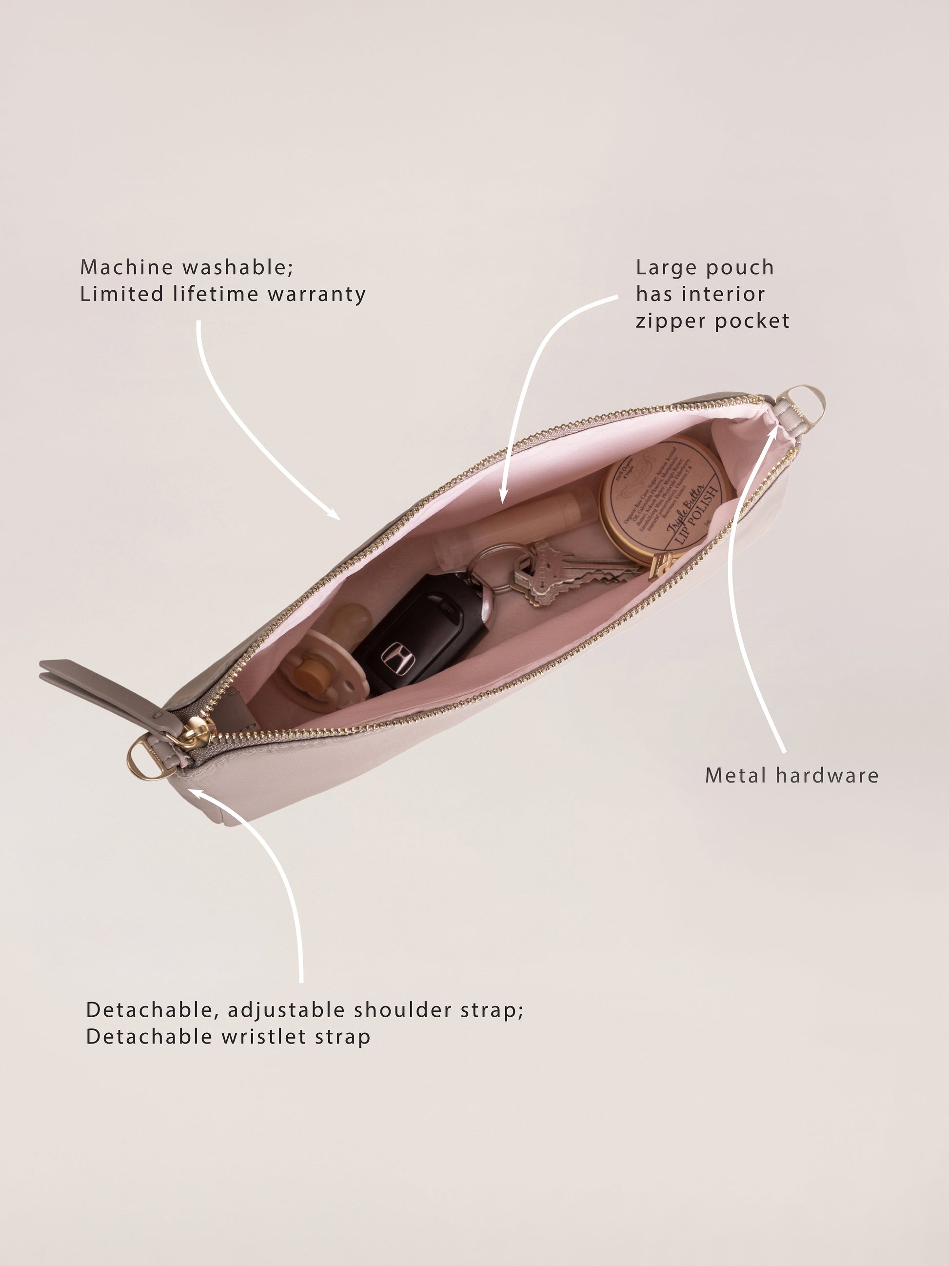 With the 3-Piece Pouch Set, you’ll never misplace your most important items again! Designed to fit in the front pouch of every JuJuBe diaper bag, these practical pouches will become your everyday go-tos. Use them to keep your essentials in one place. Pack up your keys, wallet, cell phone, sunscreen, band aids, makeup, and other items you can’t leave the house without, and transfer your pouches to whichever JuJuBe bag you choose to carry that day! The large pouch comes with a detachable, adjustable shoulder strap and can be used as a small purse. A detachable wristlet strap can be used with the small, medium, and large bag.