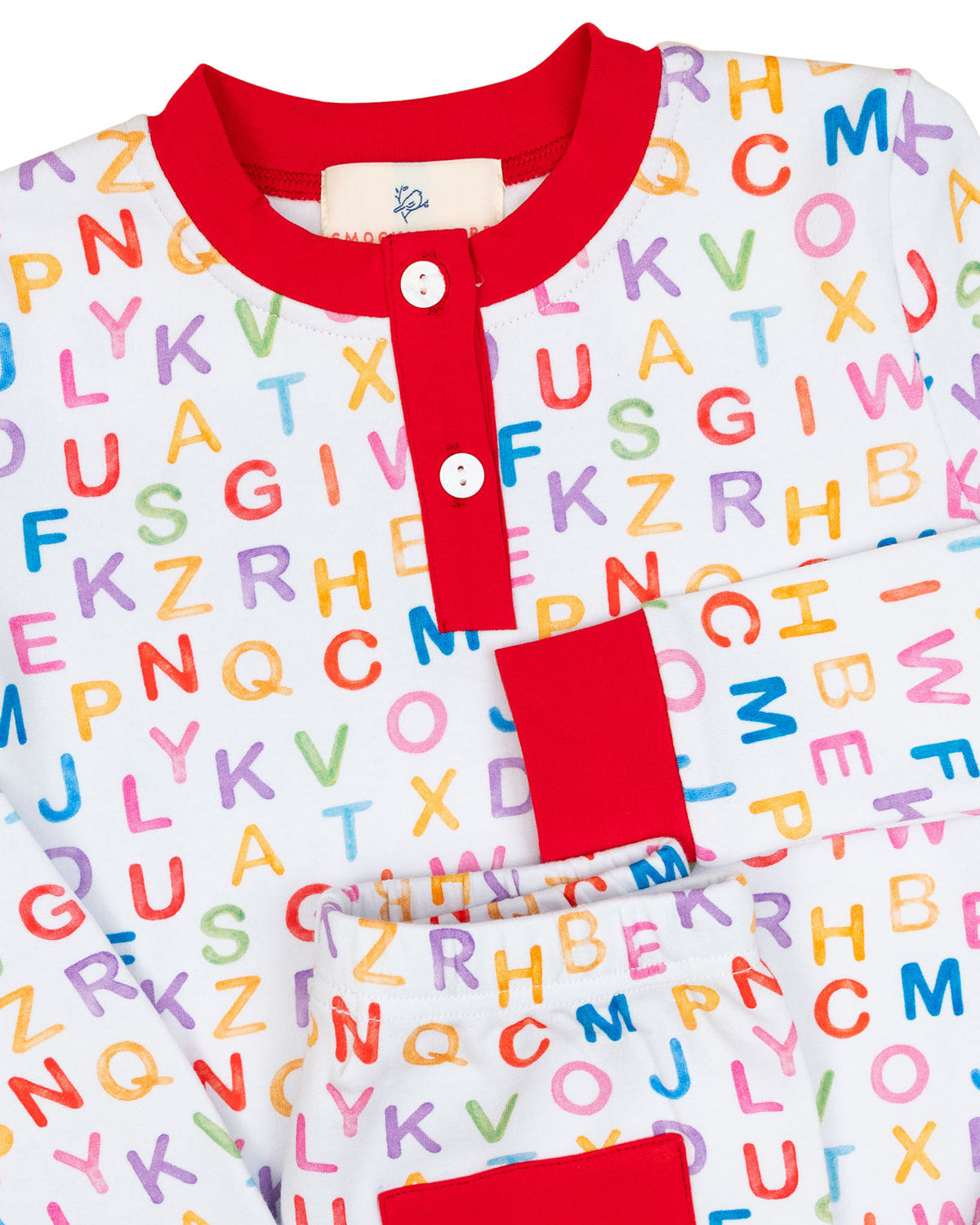 Drift off to dreamland in the cozy Alphabet Pajama Set! Featuring a playful watercolor alphabet print with contrast trim and charming pocket details, this set is perfect for bedtime or lounging in style. Made from soft, breathable fabric, it ensures all-night comfort for your little one.