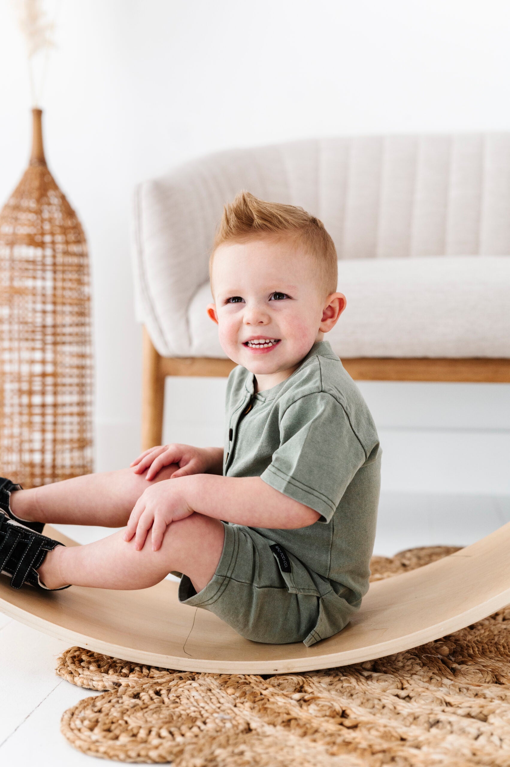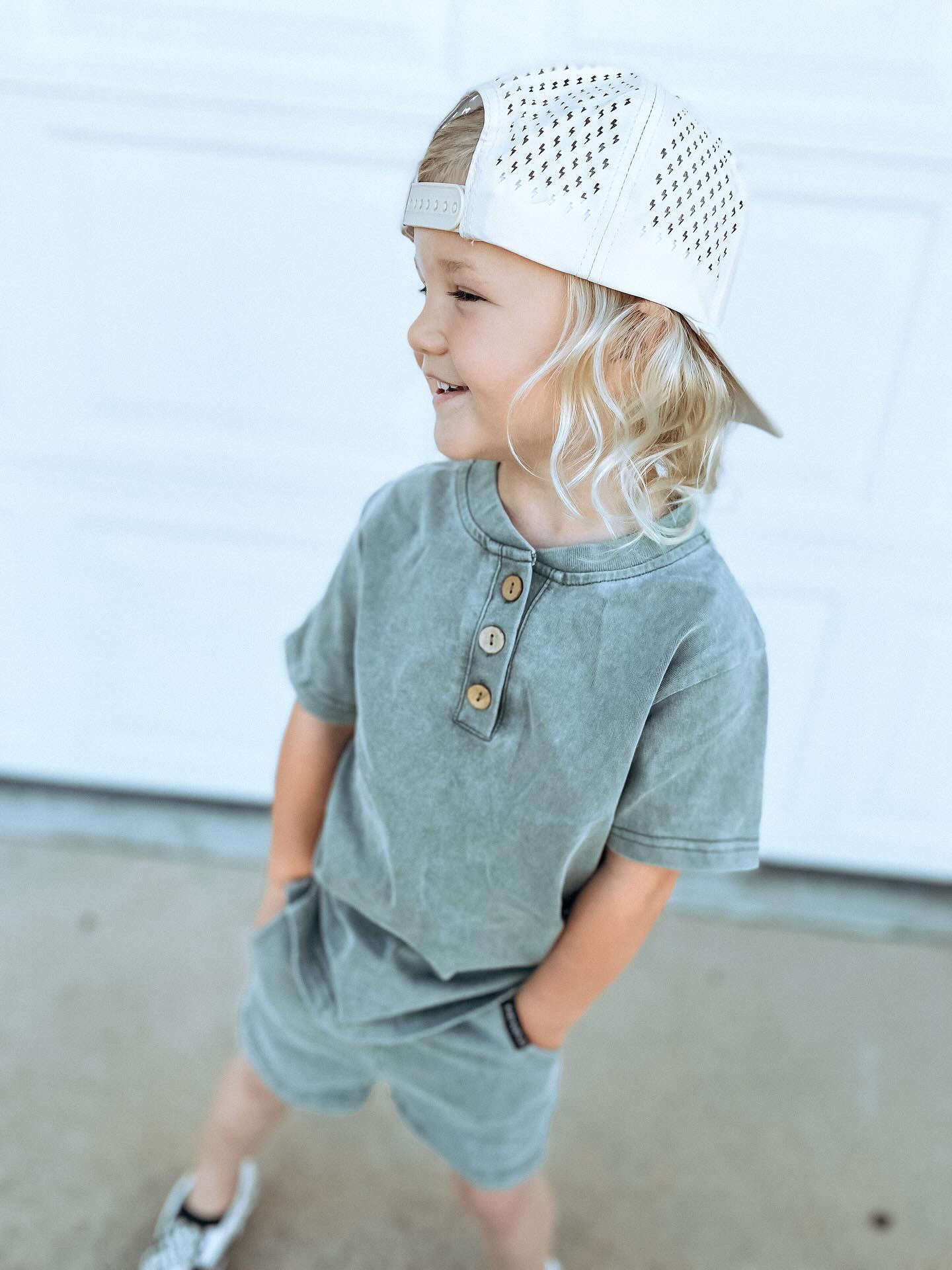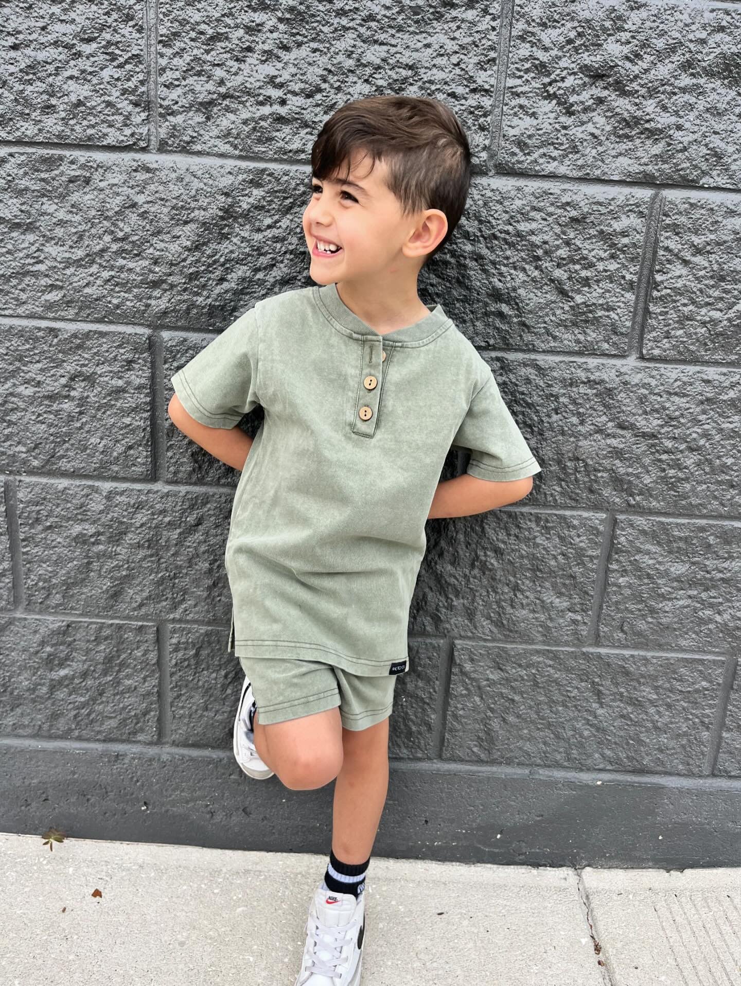 A perfect toddler shorts made with cotton (95%) and spandex (5%) blend of the dreamiest acid wash. Fit is true to size and above the knee. Waist is adjustable.