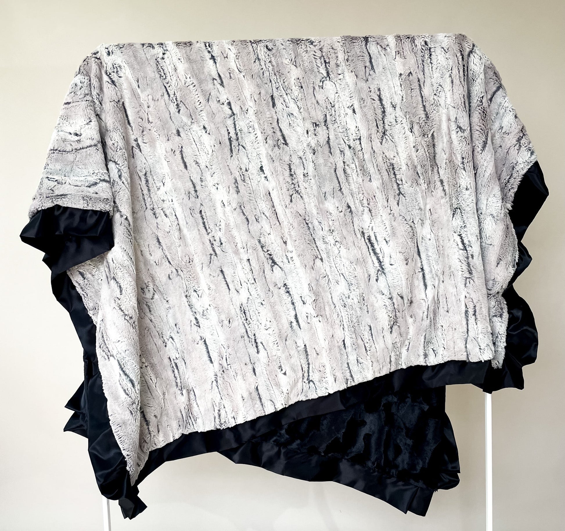 Jaycob Fox Adult Luxury Faux Fur blanket with Black cuddle fabric on the back and sides trimmed with a soft Black satin straight edge trim.