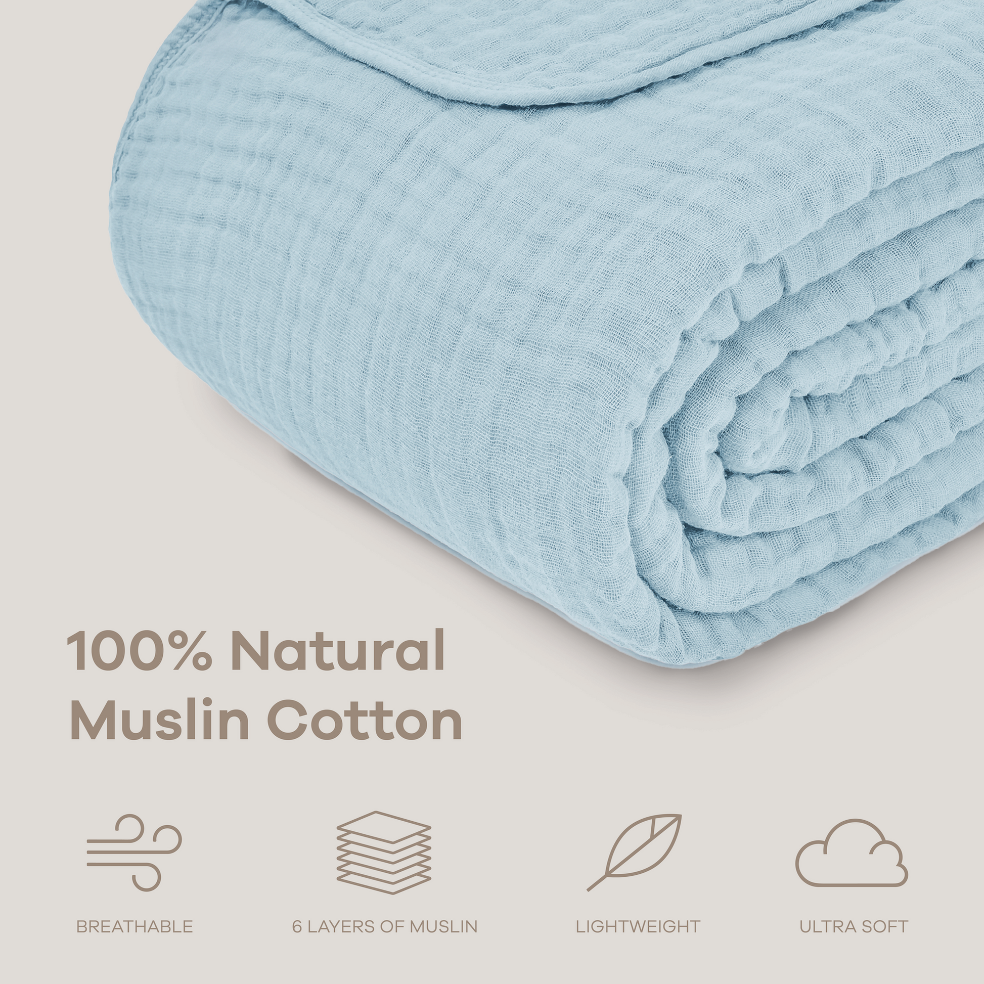 Breathable Muslin Cotton – We use 100% Muslin cotton in our soft muslin blankets which means they’re gentler on sensitive skin and keep your body cooler throughout the night.