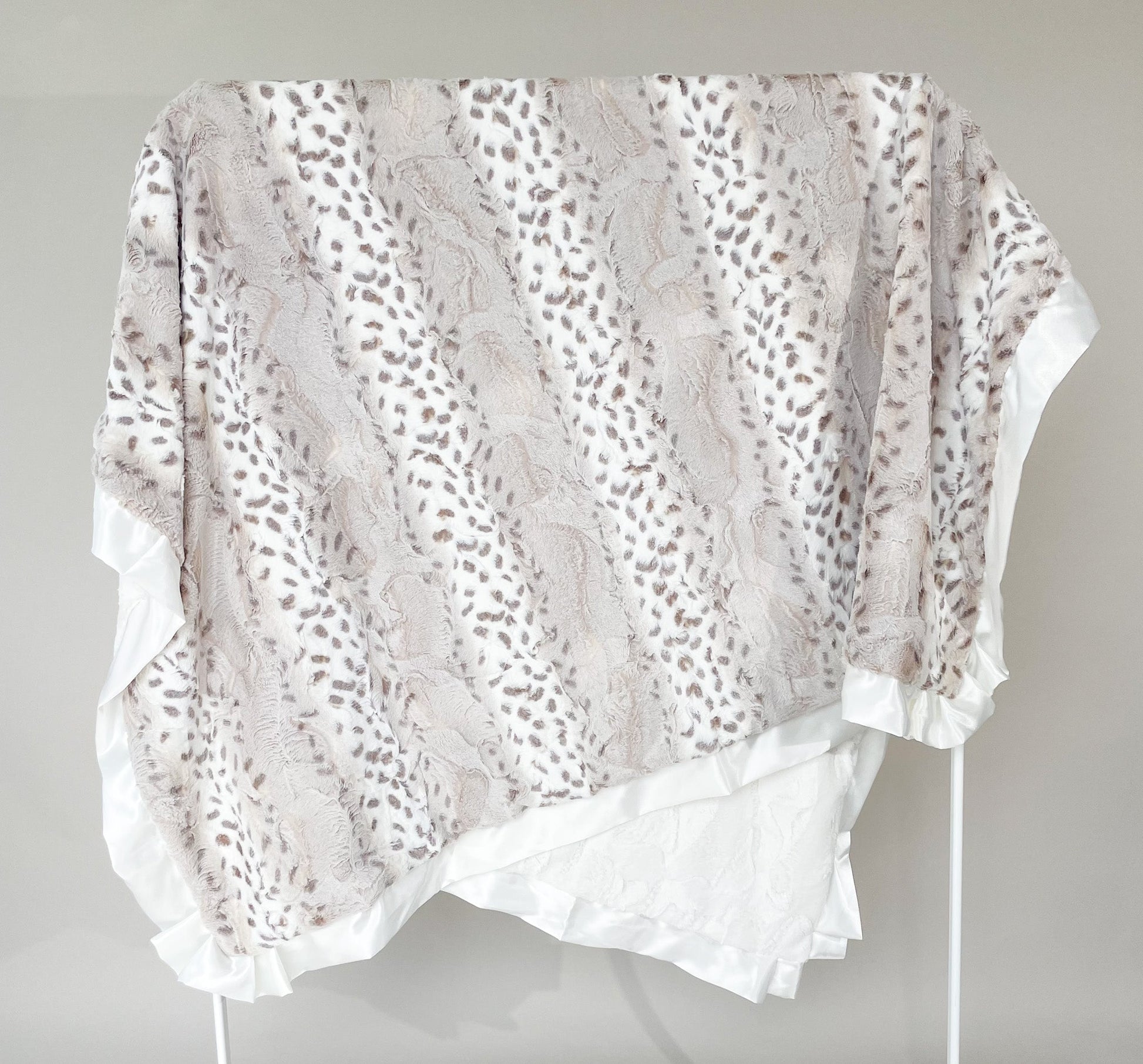 Snowcat blanket with Ivory cuddle fabric on the back and sides trimmed with a soft Ivory satin ruffle.