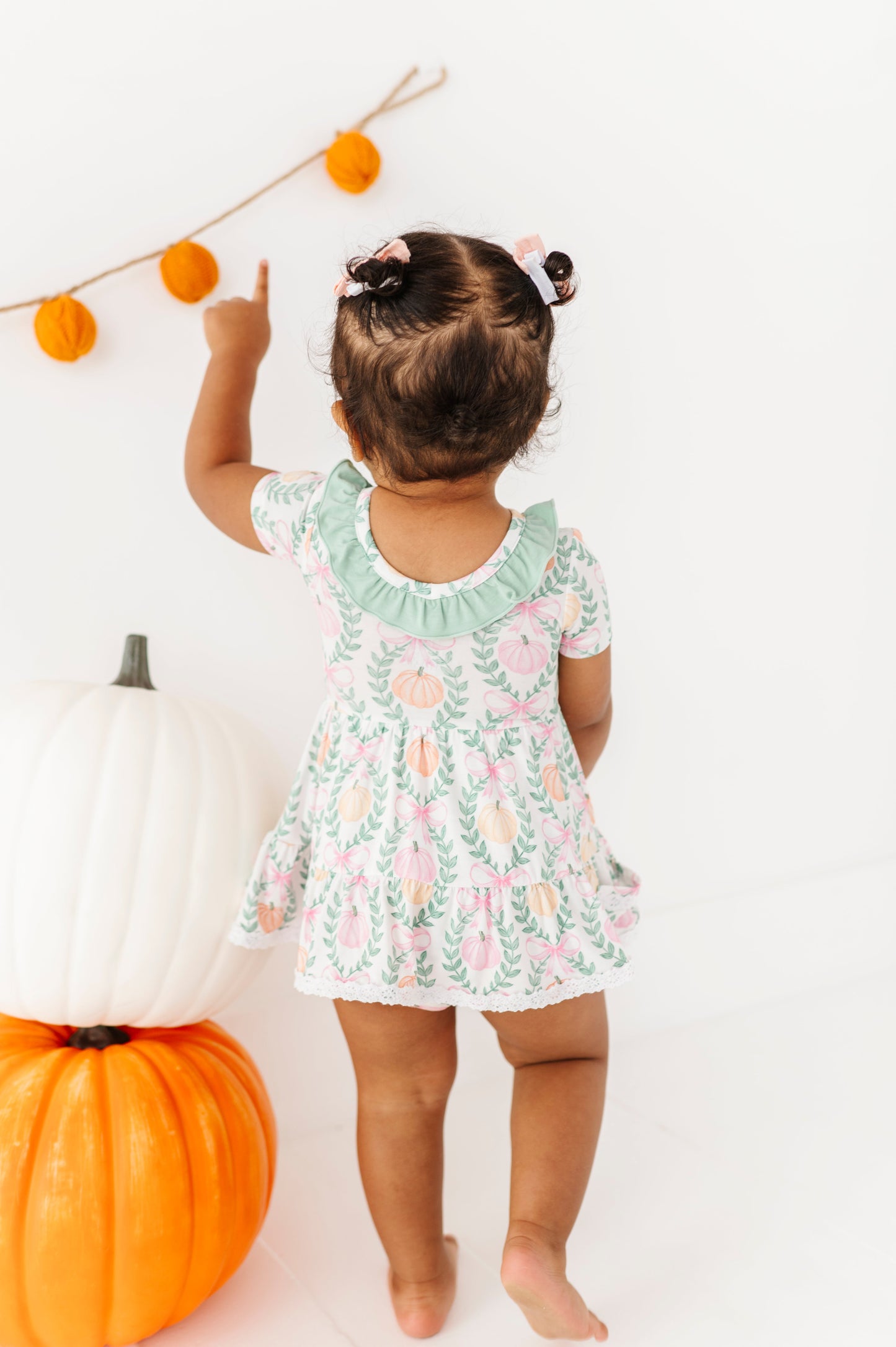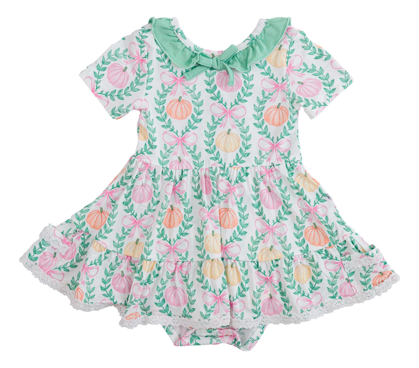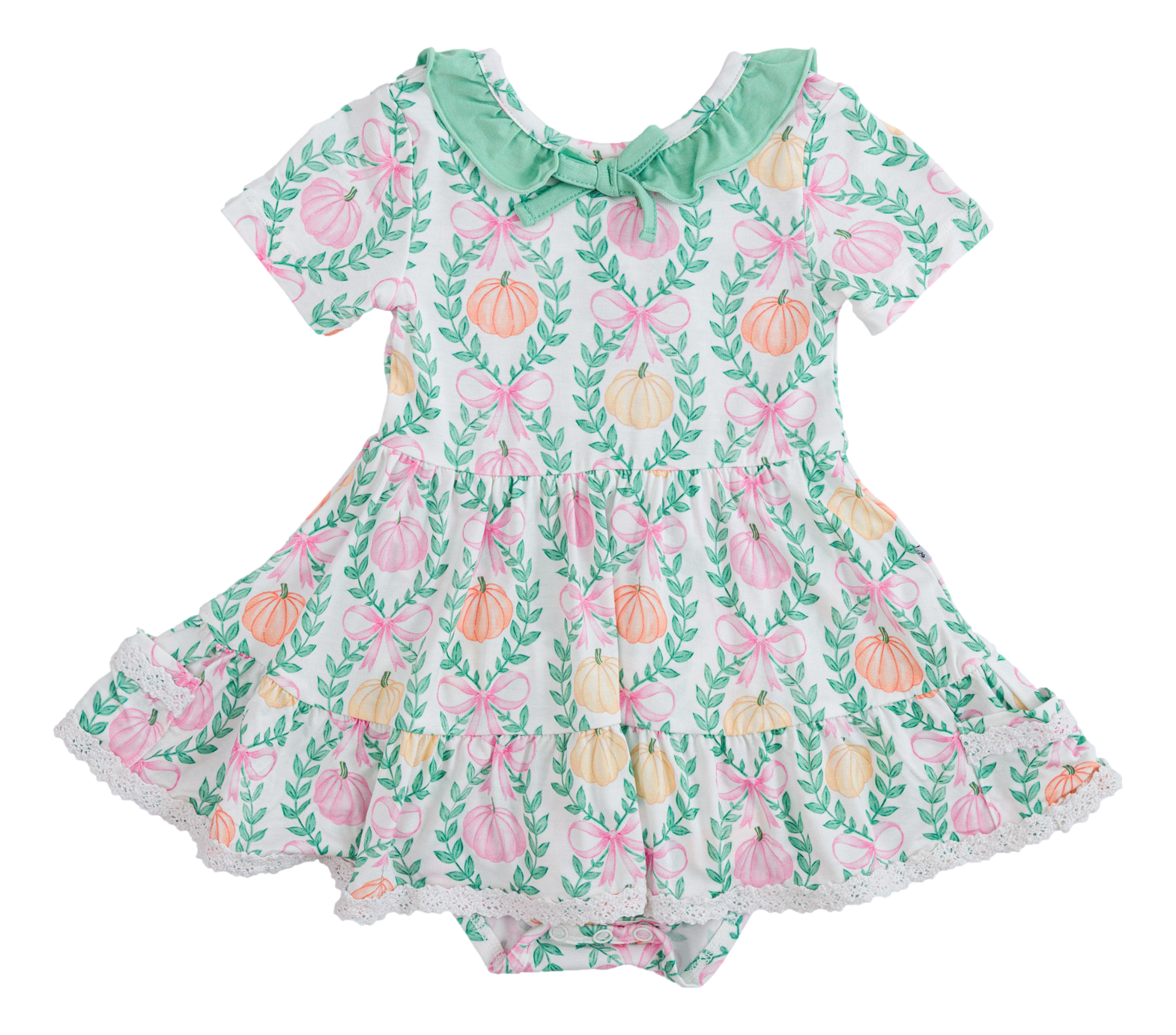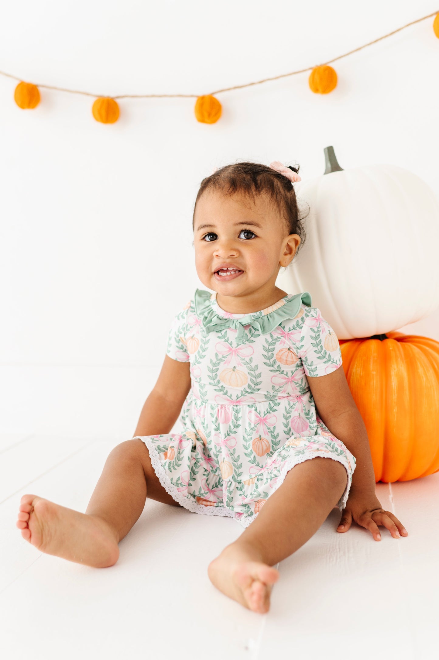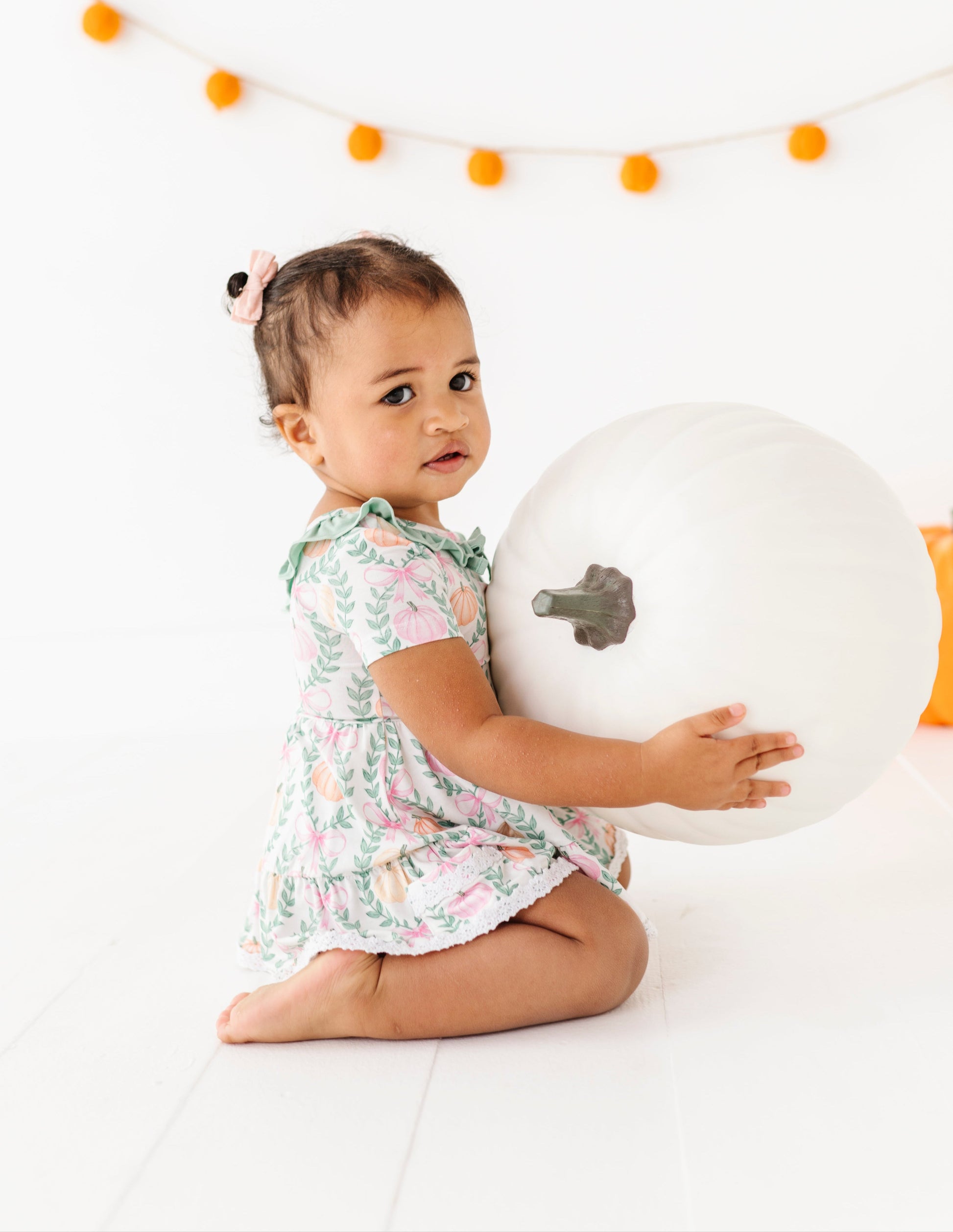 Made for the tiniest pumpkins in the patch! This darling infant dress features a pastel pumpkin print with delicate bow details, bringing all the charm of autumn in one perfect twirl. Crafted from our signature bamboo blend for softness and stretch, it includes an easy snap closure for quick diaper changes and all-day comfort. A must-have for fall photo ops, festive outings, or simply twirling into the season.