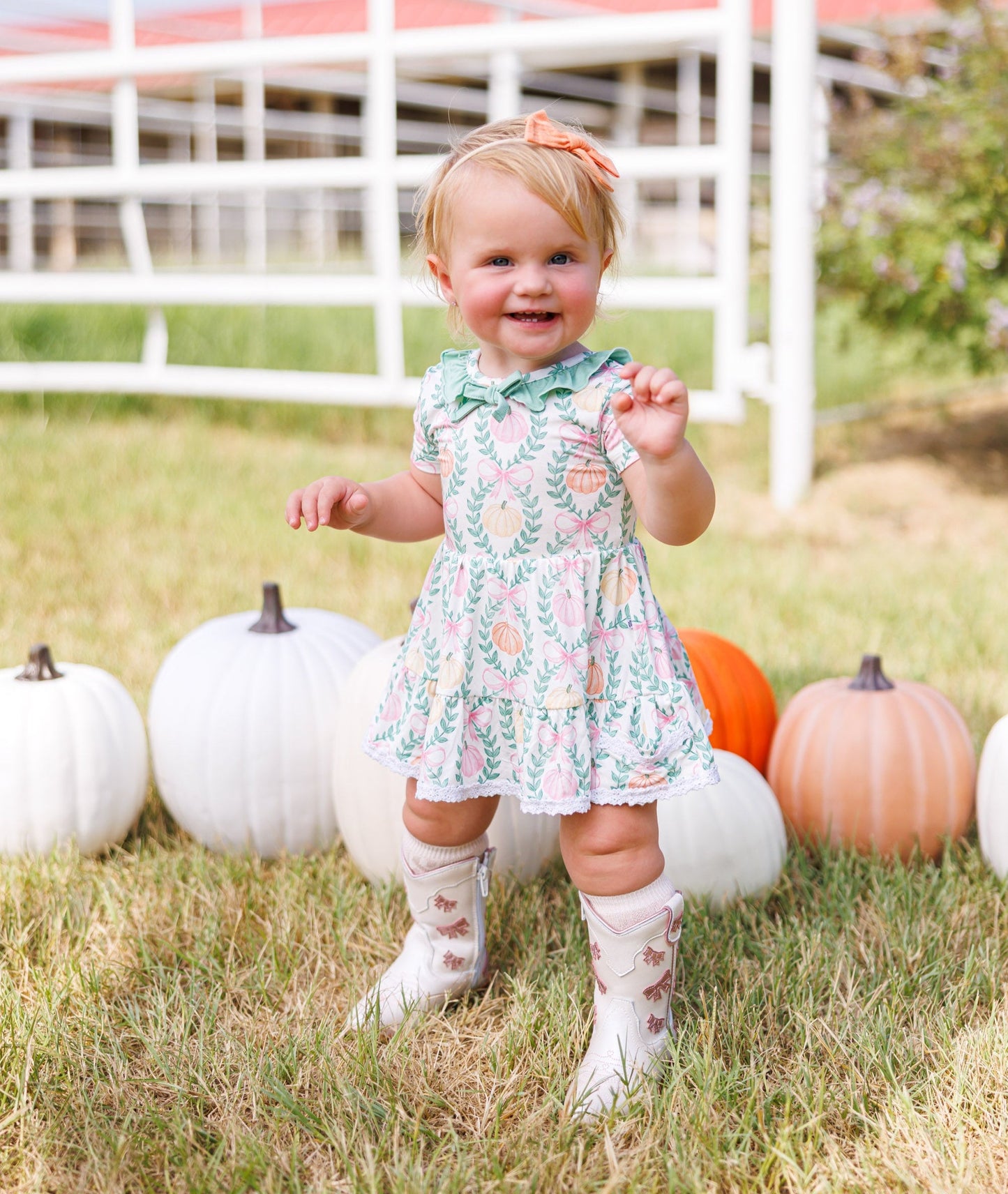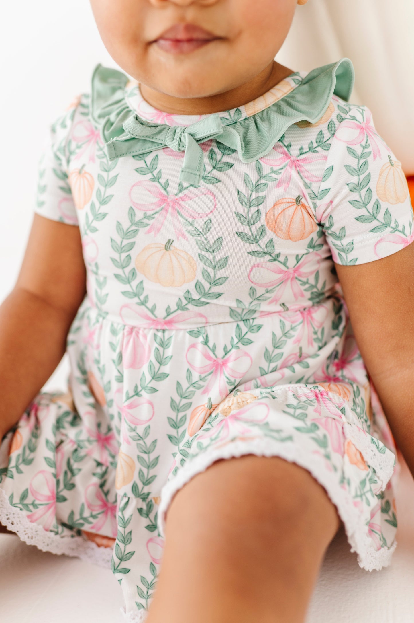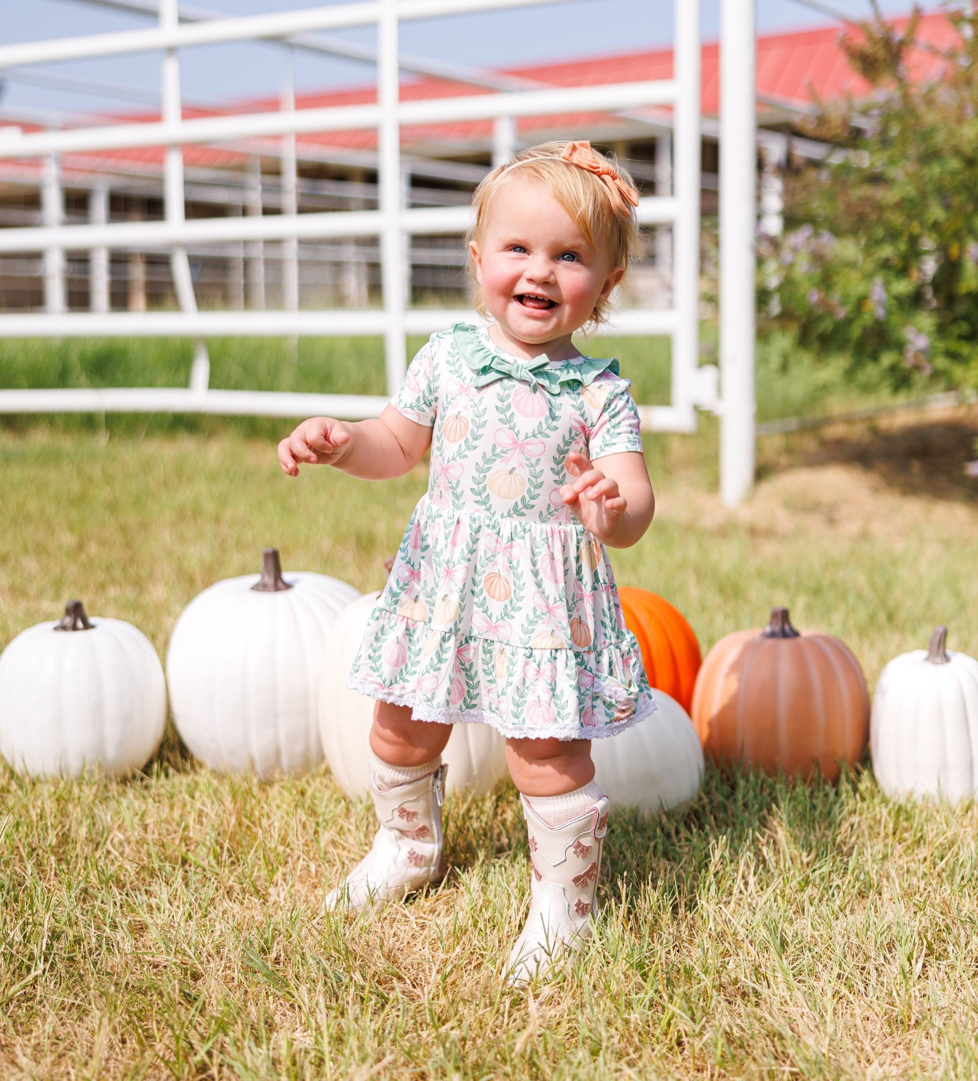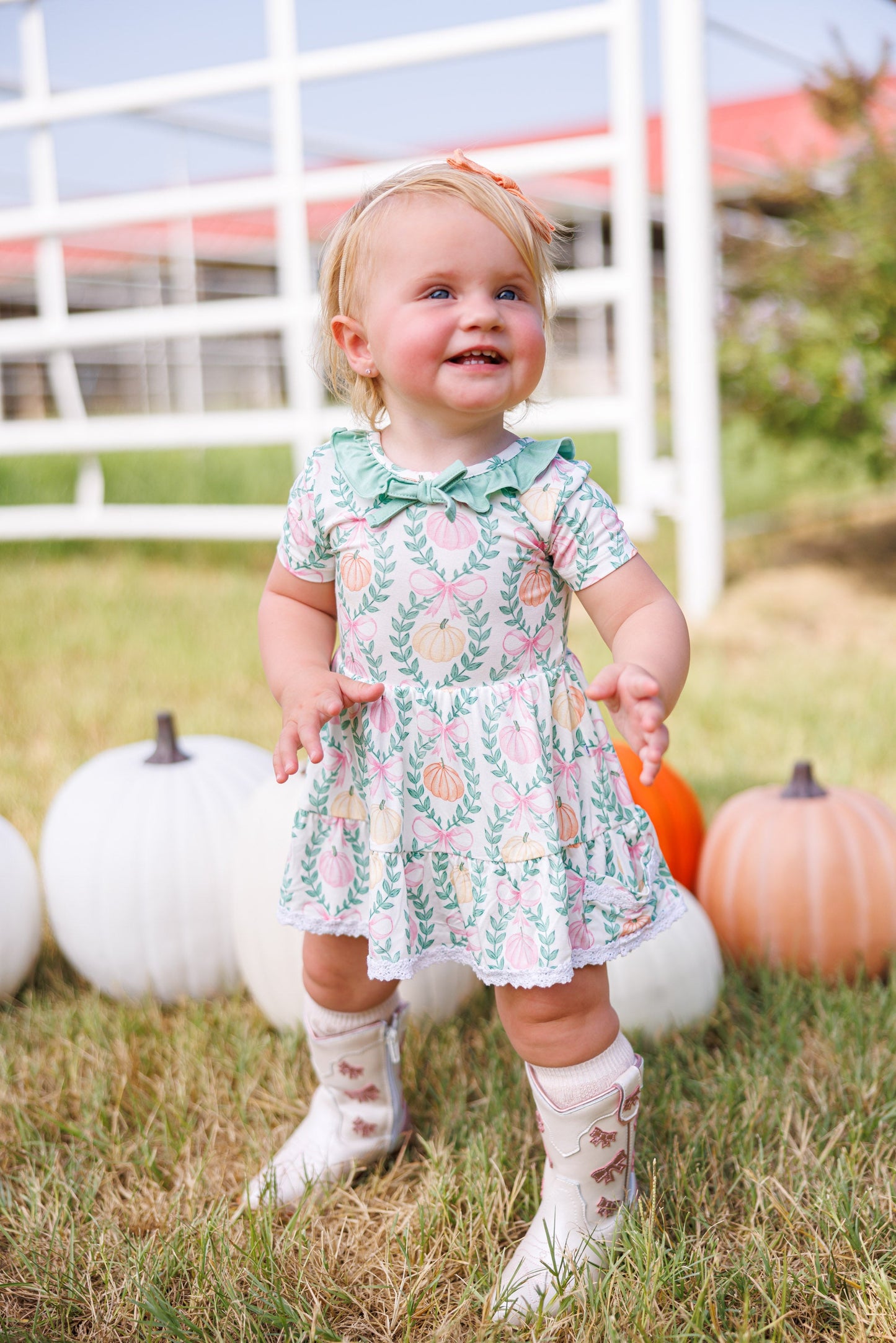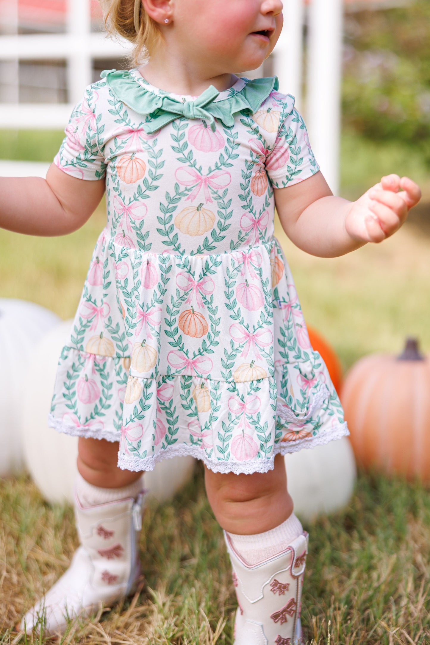 Made for the tiniest pumpkins in the patch! This darling infant dress features a pastel pumpkin print with delicate bow details, bringing all the charm of autumn in one perfect twirl. Crafted from our signature bamboo blend for softness and stretch, it includes an easy snap closure for quick diaper changes and all-day comfort. A must-have for fall photo ops, festive outings, or simply twirling into the season.