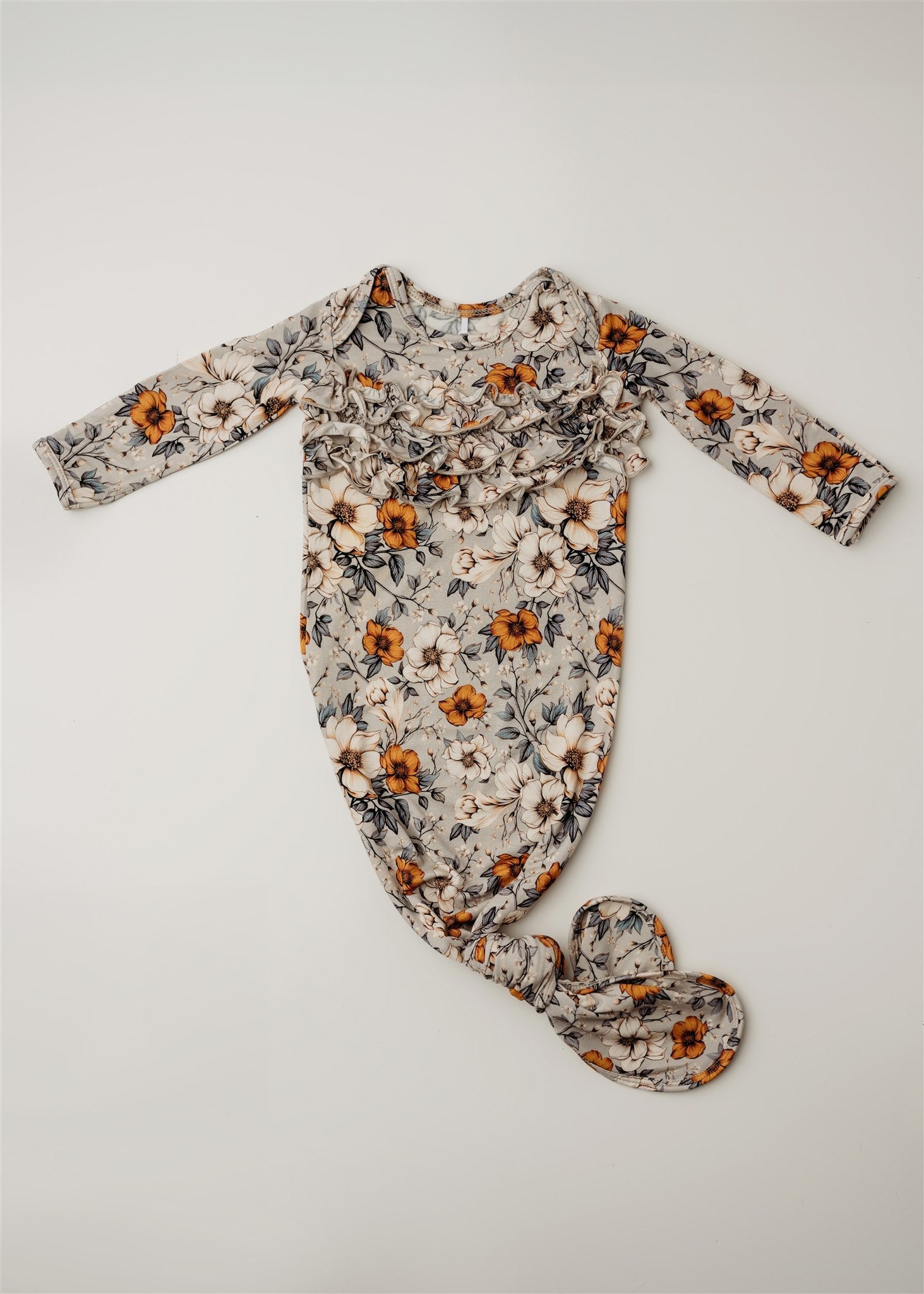 Say hello to the Amber Gardens Ruffle Knot Gown the perfect blend of softness, sweetness and girly charm! Made from our signature buttery soft viscose from bamboo, this gown is gentle on baby’s delicate skin, breathable, and stretchy for all-day comfort. The adjustable tie-bottom design makes diaper changes quick and easy, while the pull down shoulder tabs make dressing a breeze. Fold over no scratch cuffs keep your little one cozy and protected through every snuggle.