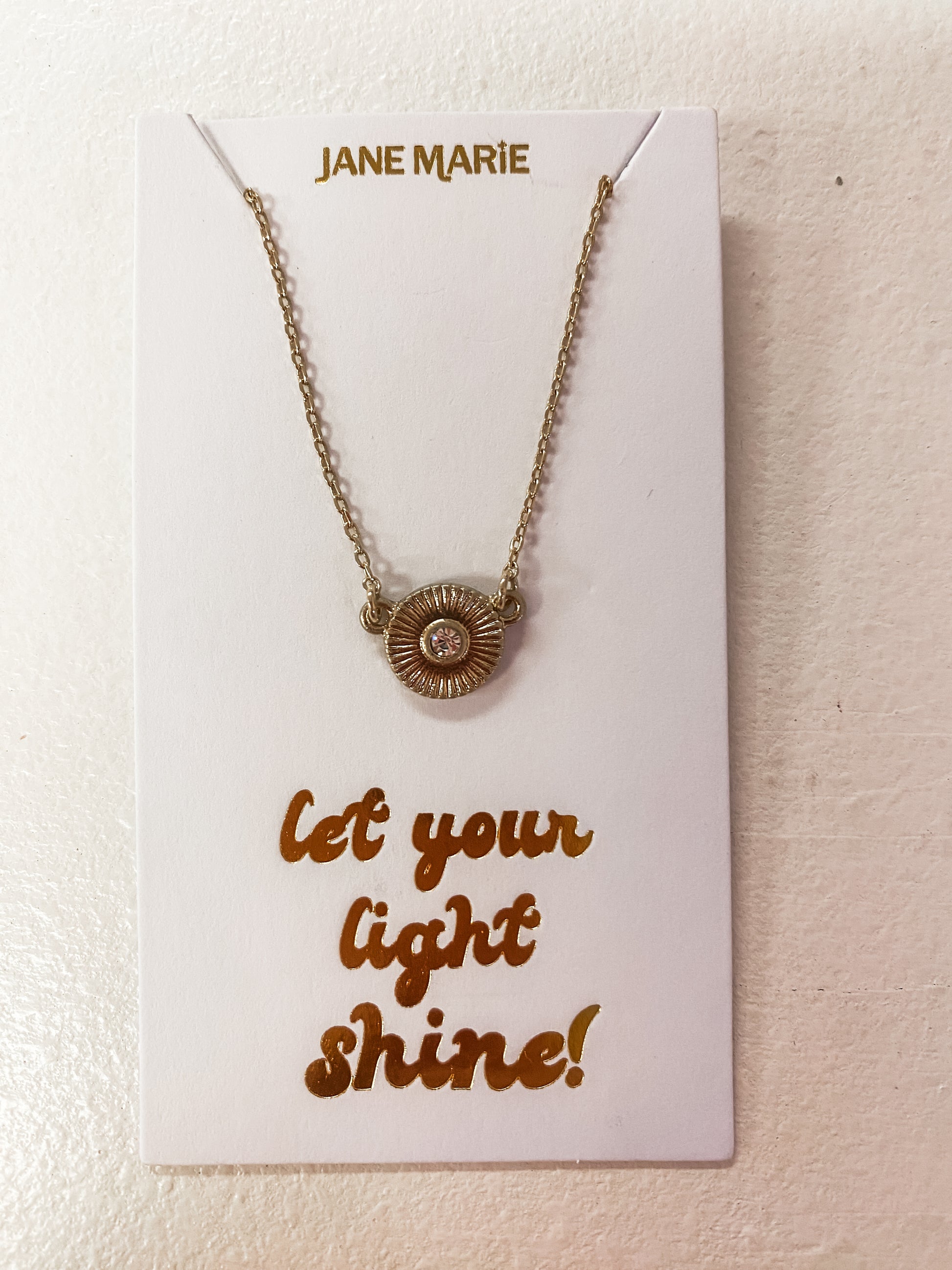 gold sunburst necklace, crystal disc charm necklace, let your light shine jewelry, boutique gift necklace, dainty inspirational necklace, Andie collection Jane Marie, everyday gold pendant necklace, faith and fashion jewelry