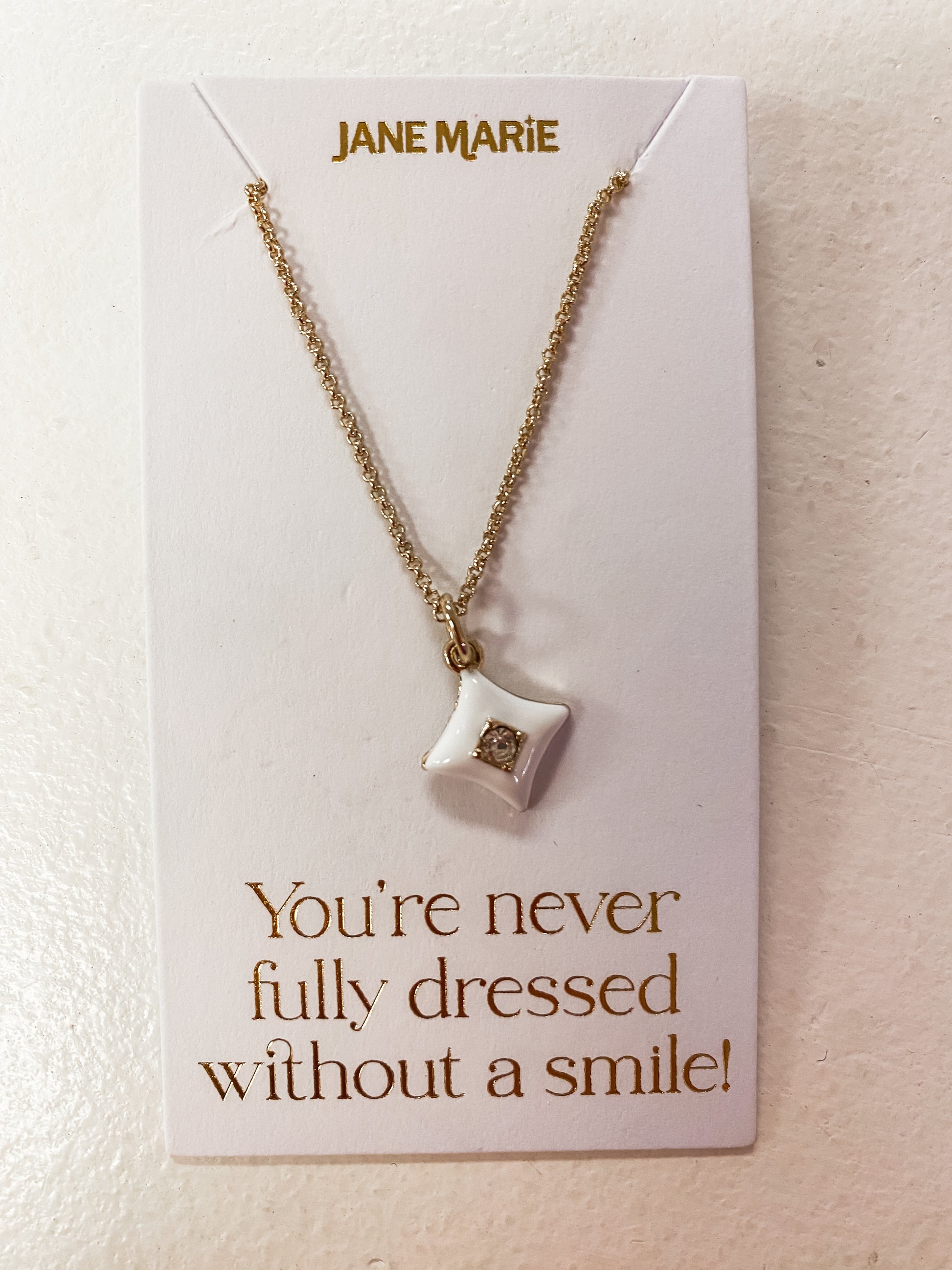 white enamel diamond necklace, crystal charm necklace, you're never fully dressed without a smile, Andie collection Jane Marie, boutique gift necklace, dainty gold chain necklace, everyday charm jewelry, inspirational necklace for women