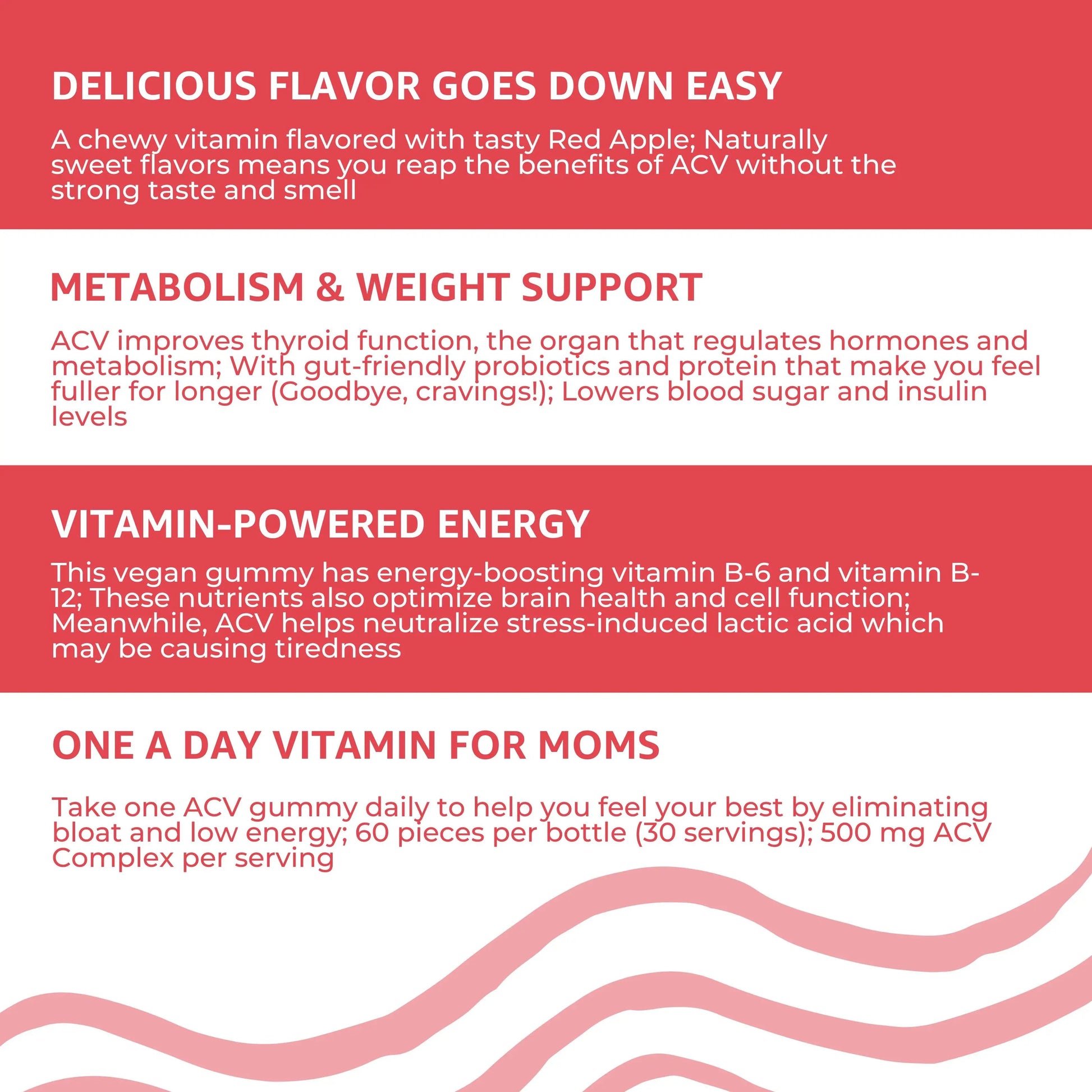 Our bottle includes 60 ACV gummies, with a recommended daily serving of 2 gummies. These vegan, Non-GMO, gelatin-free, gluten-free gummies are perfect for moms looking to enhance their energy levels and support digestive health.
